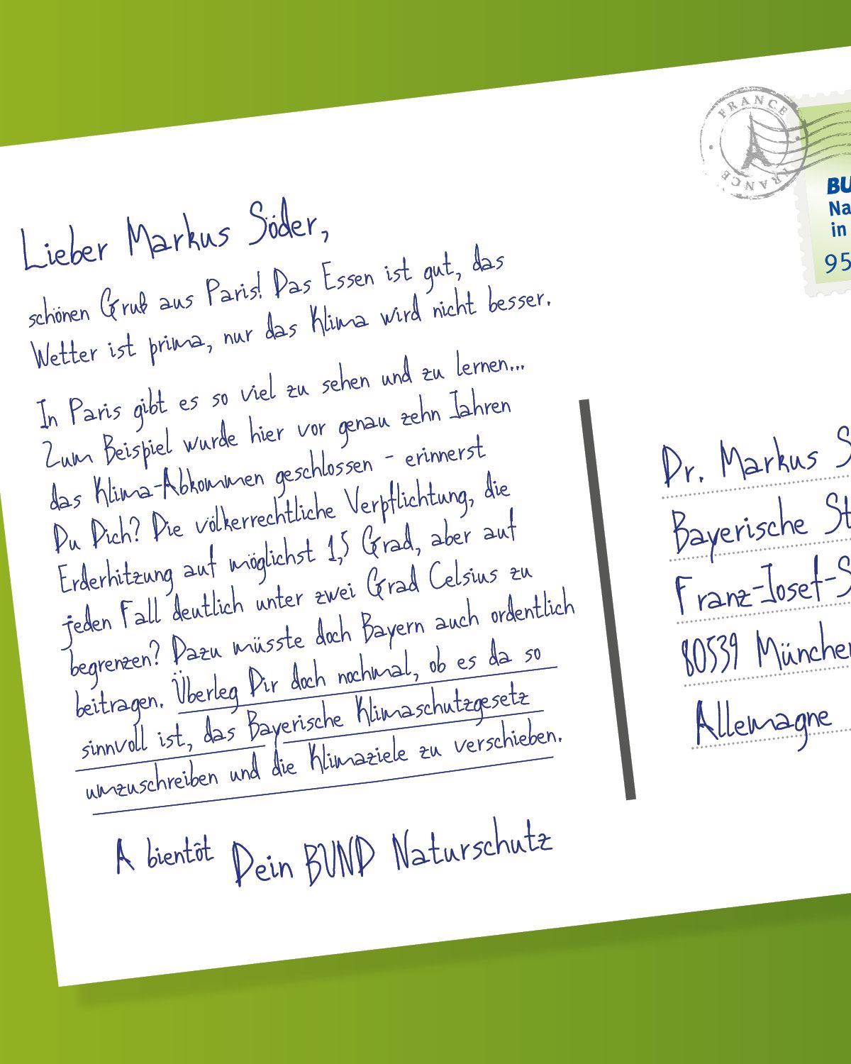 BN erinnert Söder mit „Gruß aus Paris“ an Klimaschutz