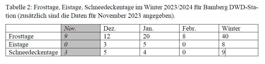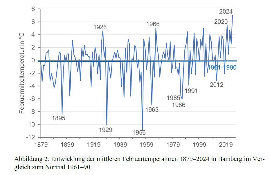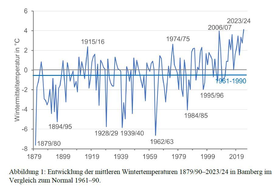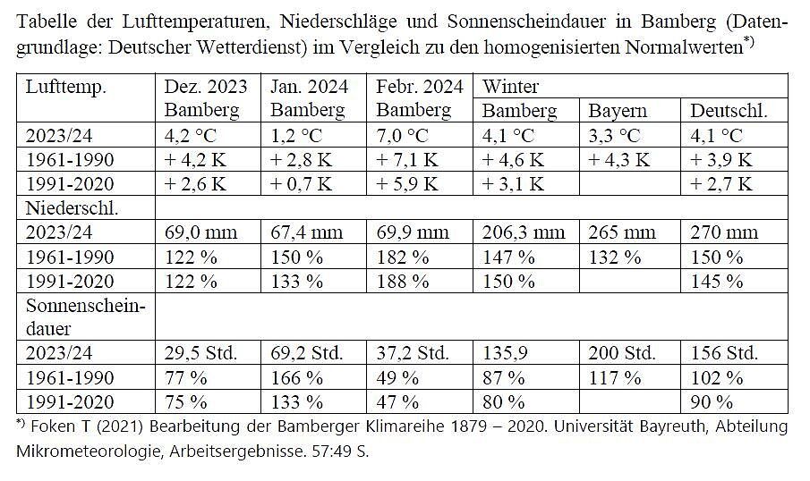 Der Winter war mit 4,1 °C (+4,6 K) deutlich zu warm (Normalperiode 1961–1990) und dies selbst noch gegenüber der Periode 1991–2020 mit +3,1 K. Obwohl schon der Dezember außerordentlich warm war und nach 2015 und 1934 der drittwärmste, war der Februar mit 7,0 °C (+7,1 K) mit Abstand der wärmste und 1,5 K wärmer als 2020. In Bamberg war der Winter 2023/24 auch der bislang wärmste und +0,1 K wärmer als 2006/07 (deutschlandweit z.T. nur der drittwärmste). Dabei war das Maximum der Lufttemperatur mit 14,7 °C am 16.02. nicht außergewöhnlich hoch. Das Minimum mit –14,4 °C am 21.01. (am Boden –16,6 °C) war im Vergleich zu den vorangegangenen Jahren sogar relativ tief. Es gab sogar 4 Tage mit Minimum unter –10 °C, allerdings lag an diesen Tagen das Maximum über 0 °C Es war also nur durch eine kräftige nächtliche Abkühlung bedingt und nicht durch eingeflossene Kaltluft. Rechnet man den November 2023 noch zum Winter hinzu, so gab es bislang nur 49 Frosttage (Minimum < 0 °C). Trotz Klimawandel wäre etwa die doppelte Anzahl zu erwarten. Auch die Zahl der Eistage ist mit 8 Tagen außergewöhnlich niedrig. Wäre der Februar ein März, so wäre dieser immer noch +3,6 K (Normalperiode 1961–90) zu warm (+2,3 K, 1991–2020) und selbst ein April wäre fast normal mit –0,6 K (1961–90 bzw. –2,4 K für 1991–2020)! Wenn dennoch die Pflanzenwelt nicht die Entwicklung wie Ende März aufweist, so kommt es daher, dass die Wärmesummen (Tage mit positiven Mitteltemperaturen) noch nicht ausreichen, da die Wärmesummen der Wintermonate nur einen geringen Beitrag zur Pflanzenentwicklung haben.