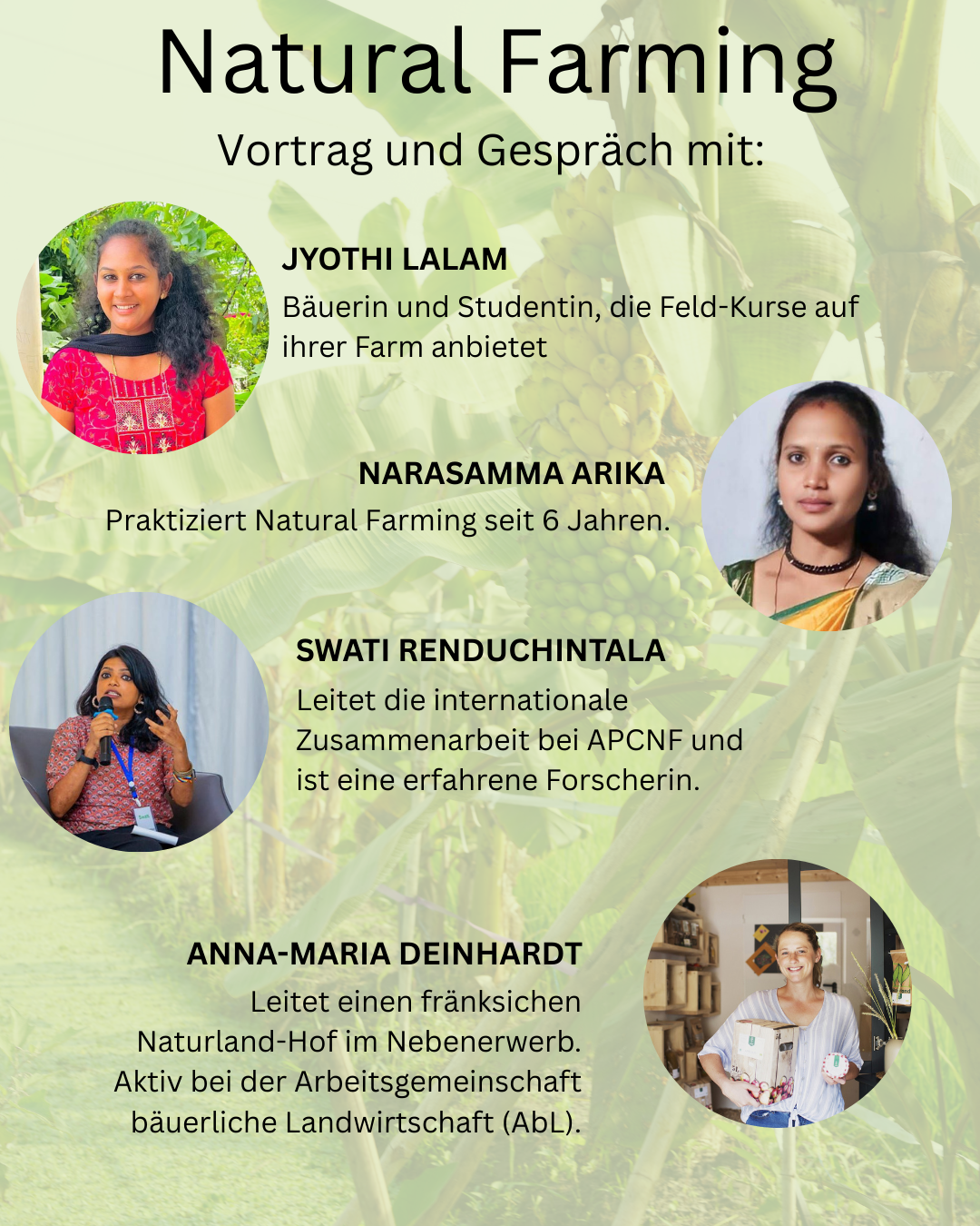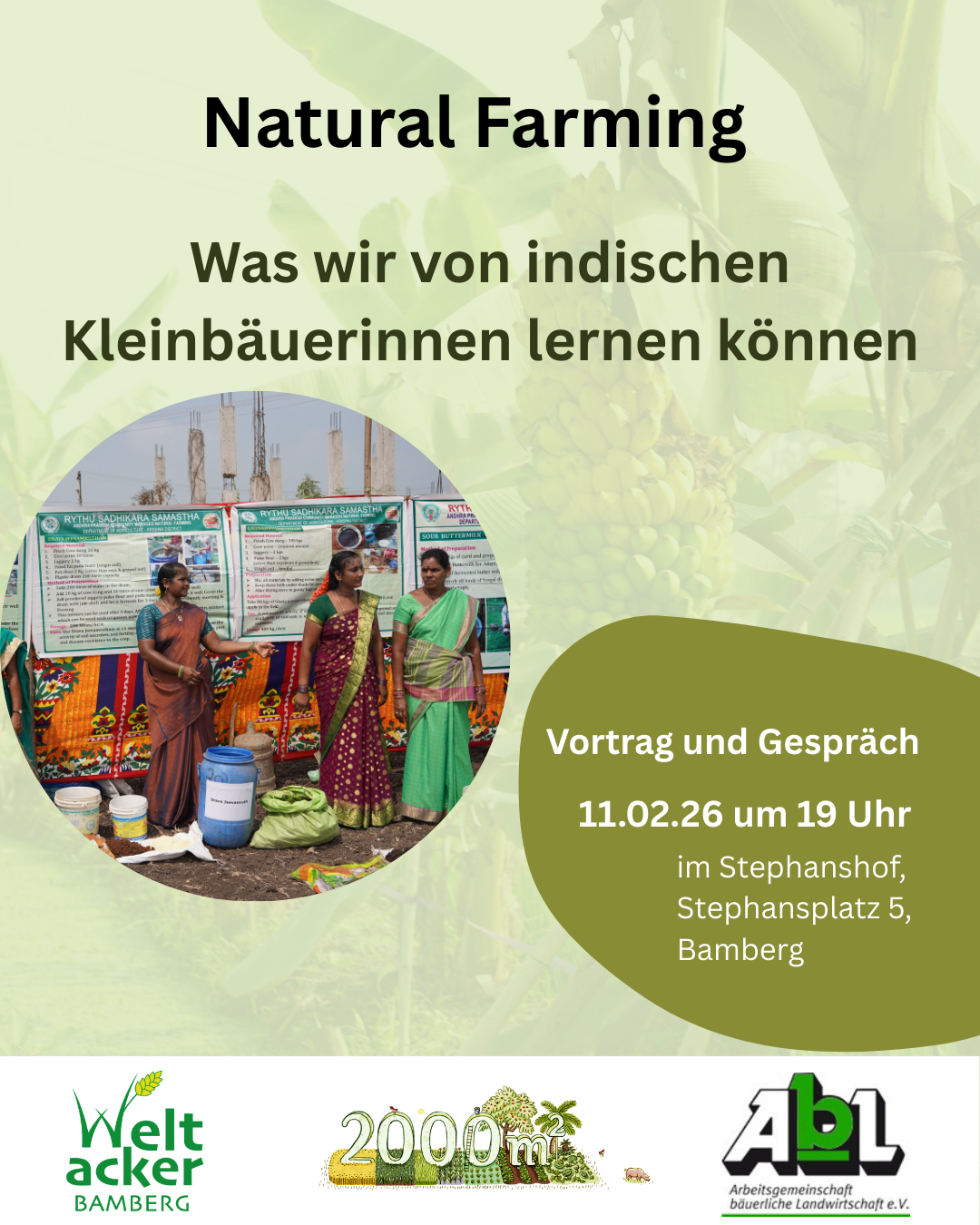 Zu Gast sind Vertreterinnen der Organisation Andhra Pradesh Community Managed Natural Farming (APCNF) sowie Anna-Maria Deinhardt, die in Wohlmuthshüll bei Ebermannstadt einen Naturland-Betrieb im Nebenerwerb leitet. Natural Farming in Andhra Pradesh erzählt eine beeindruckende Erfolgsgeschichte: Kleinbäuerinnen sichern sich durch die Wiederbelebung der Böden gesunde Lebensmittel, sichere Einkommen und stabile dörfliche Gemeinschaften. Lokale Frauenselbsthilfegruppen spielen dabei eine tragende Rolle. Bei der Veranstaltung, die im Stephanshof in Bamberg stattfindet, steht im Mittelpunkt, was wir von den Erfahrungen und dem Wissen der indischen Bäuerinnen lernen können.