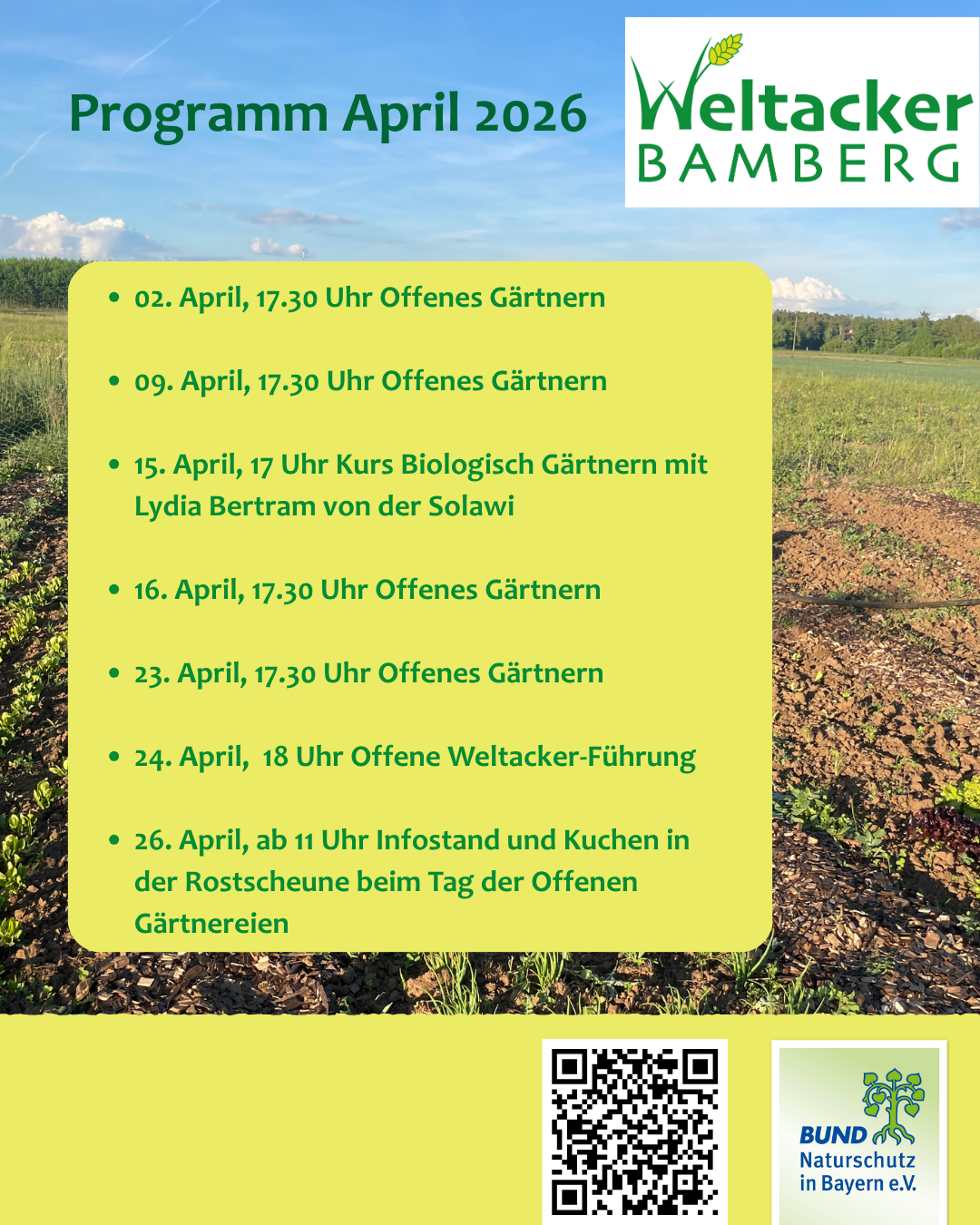 Auf dem Weltacker finden spannende Veranstaltungen statt. Für Schulklassen werden Workshops zu Themen rund um nachhaltige Landwirtschaft und Ernährung angeboten. Hobbygärtner*innen können sich mit Gärtnerkursen weiterbilden. Führungen, Kunstateliers oder Kochkurse gibt es für alle Altersgruppen. Der Weltacker ist als Ausstellung offen zugänglich und kann jederzeit selbstständig erkundet werden. Hier findest Du unser Bildugnsangebot.